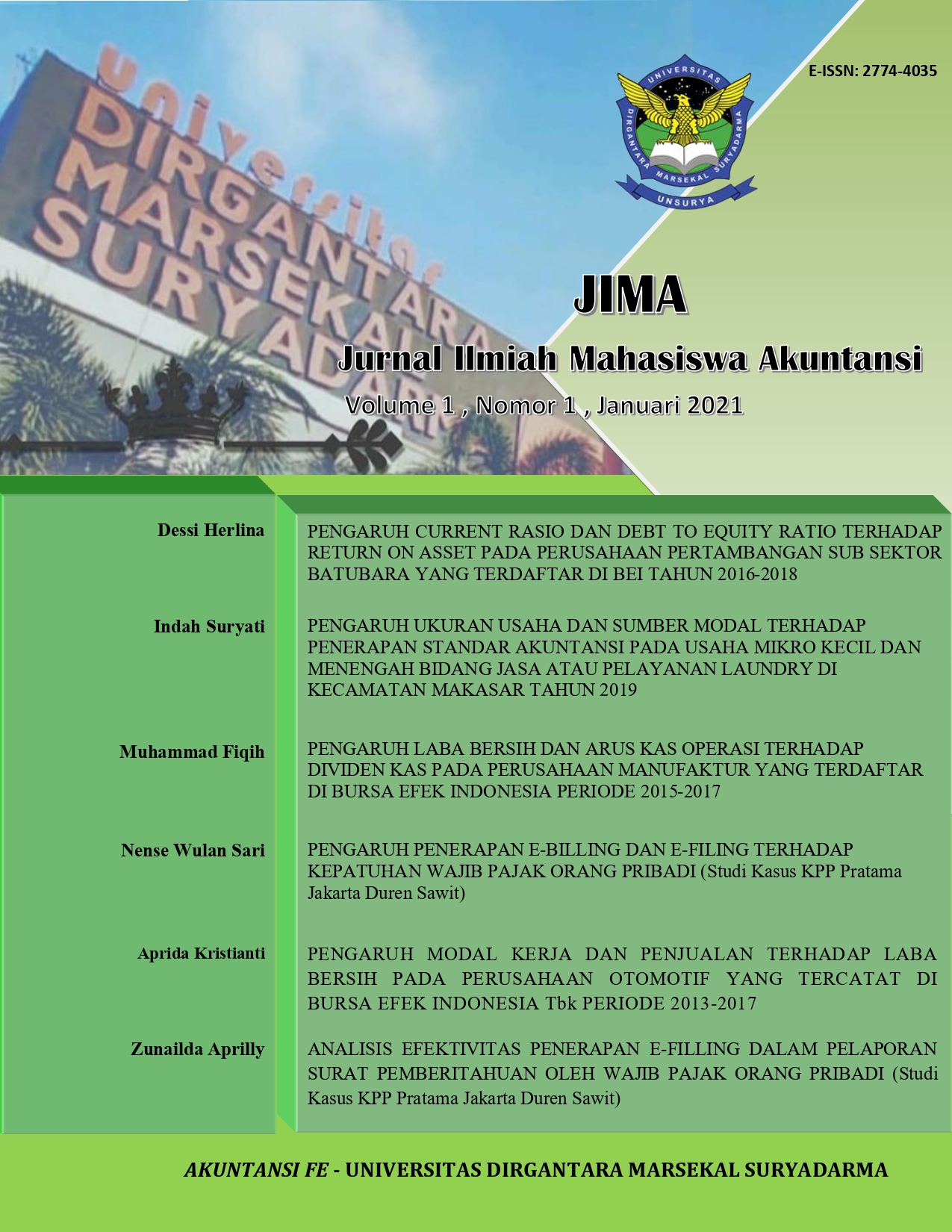 Jurnal Ilmiah Mahasiswa Akuntansi (JIMA) merupakan media jurnal elektronik sebagai wadah untuk publikasi hasil penelitian dari tugas akhir mahasiswa. Artikel ditulis bersama dosen pembimbingnya serta diterbitkan secara online.